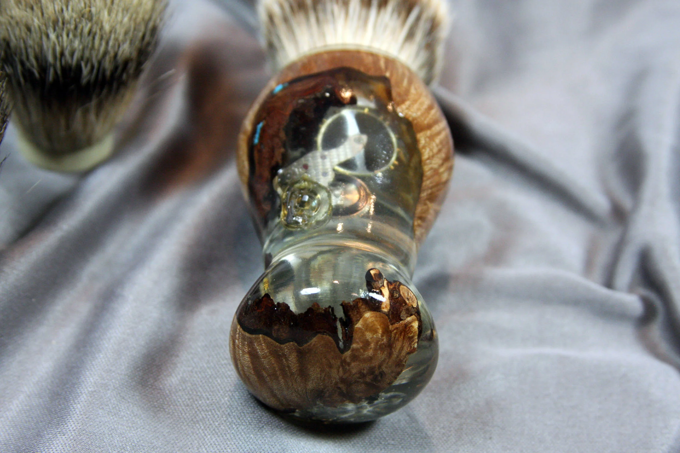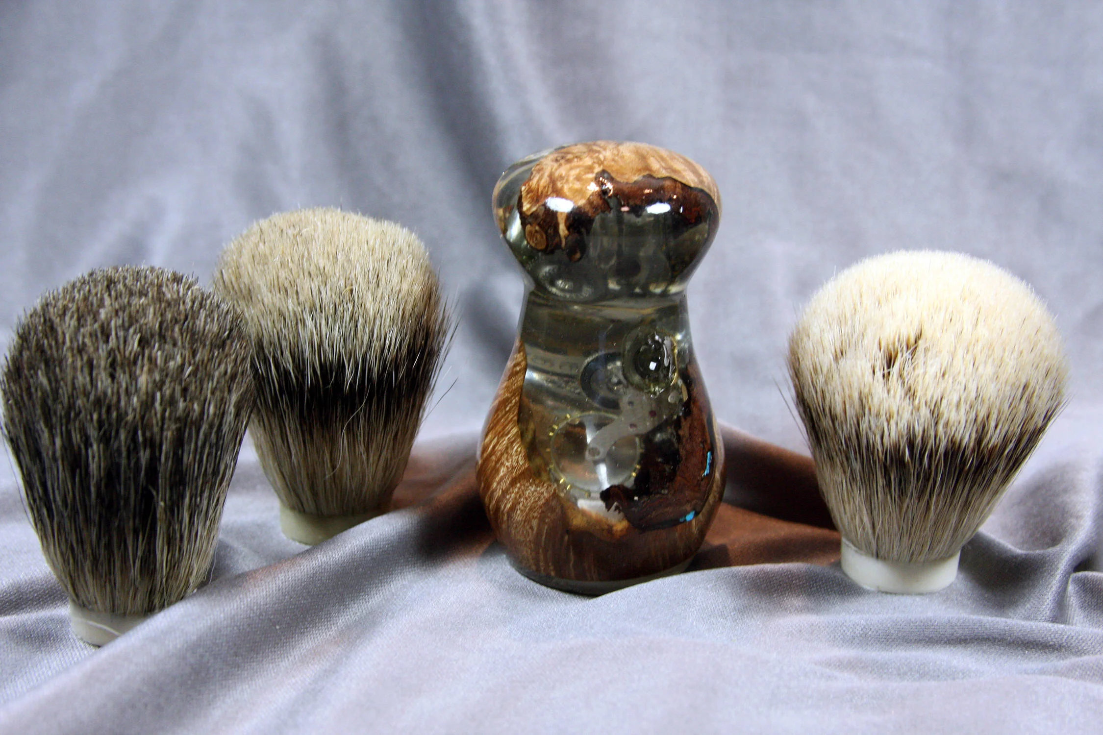 We shaped this brush right here in our South Seattle shop and meticulously inlaid watch gears and cogs into the voids in the wood before casting in a clear resin. This brush is a truly one of a kind way to upgrade your shaving routine.